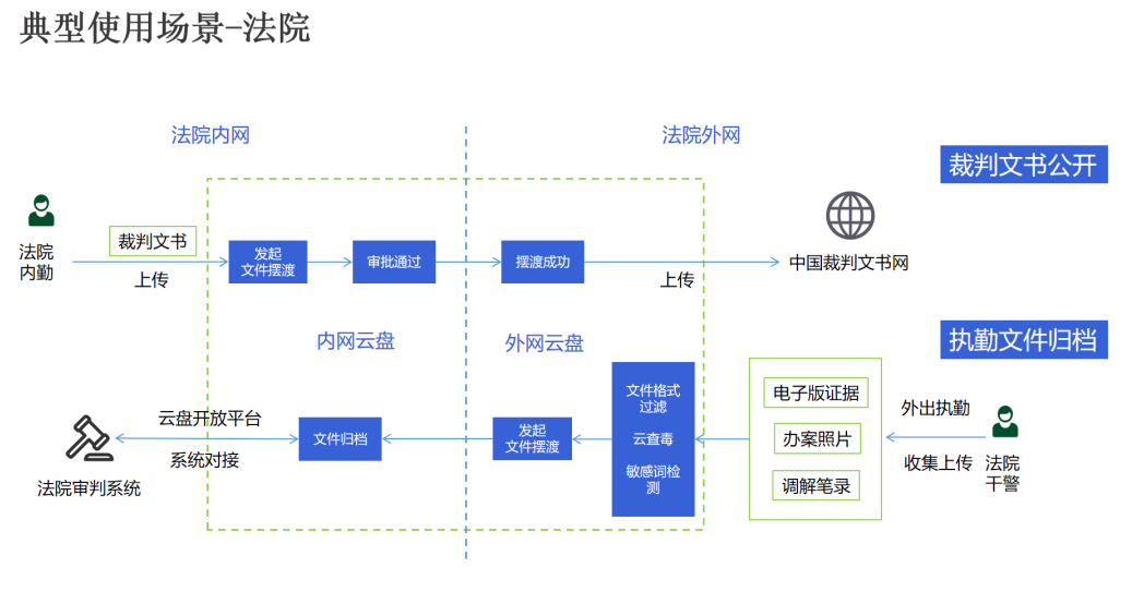 陈军以法院为例,详细介绍了法院行业3大业务场景中如何实现安全便捷的文件跨网交互: